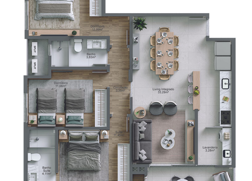 As unidades contam com 3 dormitórios (sendo 1 suíte), sacada gourmet com churrasqueira a carvão, rebaixo em gesso, persianas automatizadas, tubulação para água quente e espera para split.
